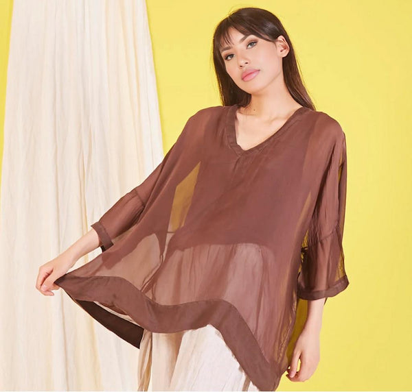 BZNA Seidenbluse Coffee Tunika Seidentunika mit V -Ausschnitt Seidenchiffonbluse Fledermaus Ärmel oneSize