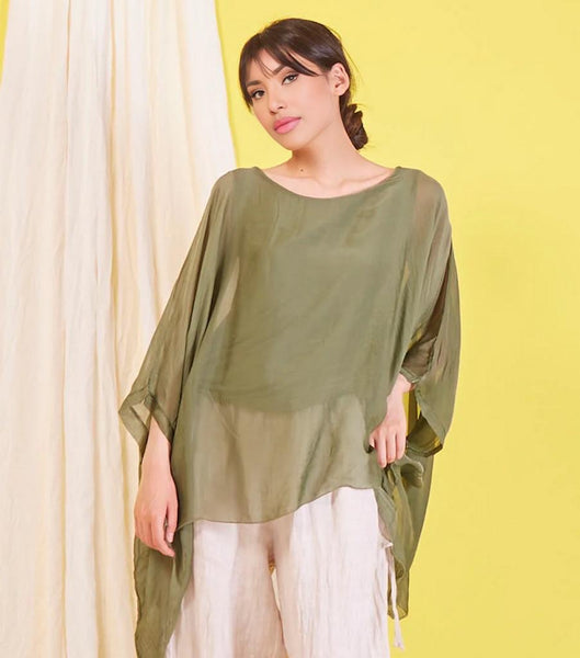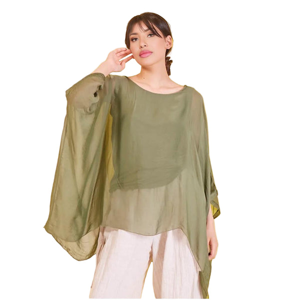 BZNA Seidenbluse Olive Grün Tunika Seidentunika Seidenchiffonbluse Fledermaus Ärmel oneSize