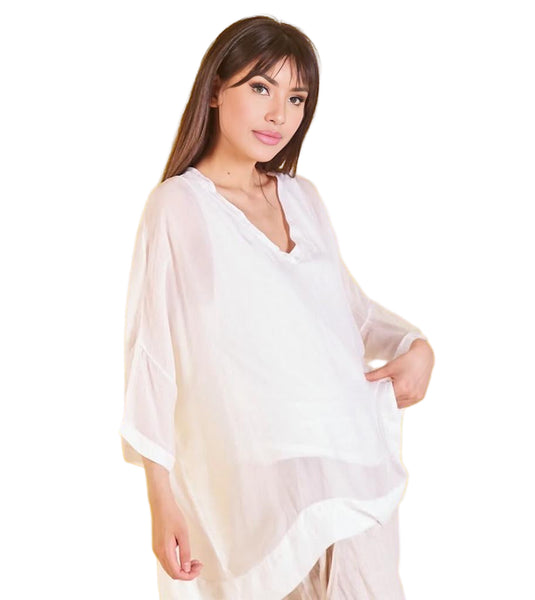 Größe: Einheitsgröße, Uniquesize, Onesize 34-44 Sehr schöne Tunika aus 30% Seide,70% Viskose wunderbar und leicht zu tragen. Unterteil 95% Viskose 5% Elasthan. Sehr angenehm zu tragen, fließendes und leichtes Material